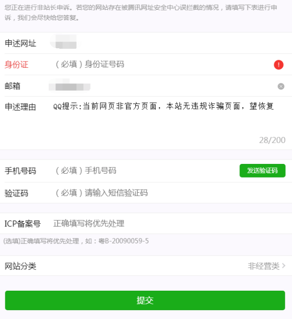 填寫好網(wǎng)址,身份證郵箱,手機(jī)驗(yàn)證,備案號,選擇非經(jīng)營類。提交申述。